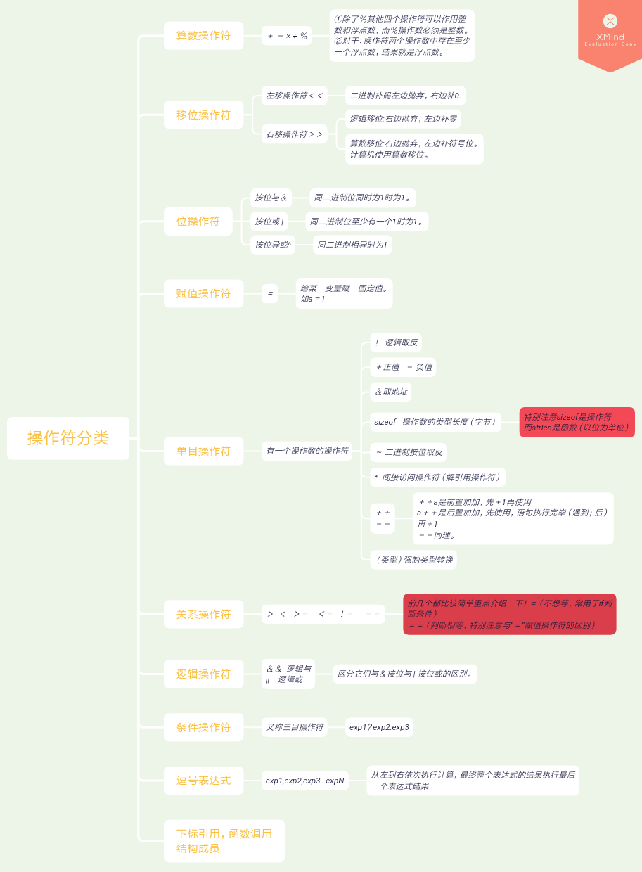 操作符详解: 首先贴一张自己制作的思维导图 移位操作符:(箭头指向哪边向哪边移) << :左移操作符 作用:将保存的数据二进制位(补码)向左移动 具体用法:左边抛弃,右边补零。 .>>:右移操作符 作用:将保存的数据二进制位(补码)向右移动 具体用法:右移操作符分为算数移位和逻辑移位 算数移位:右边抛弃,左边补原来的符号位(计算机采用算数移位); 逻辑移位:右边抛弃,左边直...